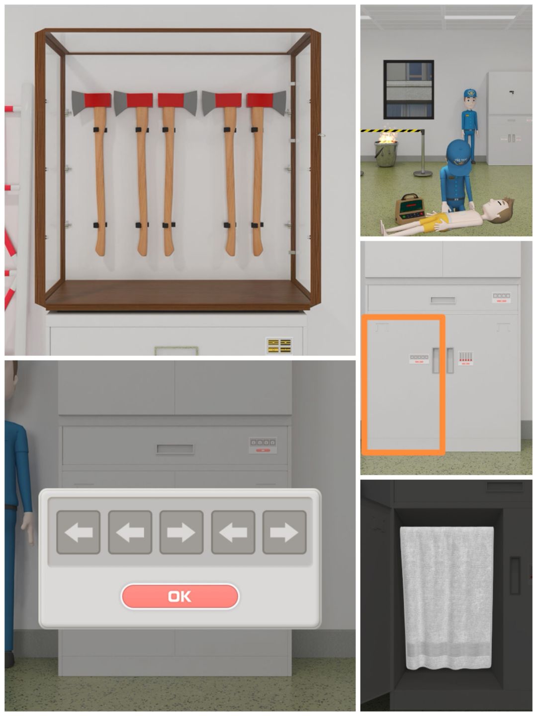 7. 查看斧子的斧头朝向,可以打开救援场景的左边柜子,得到一条毛巾。