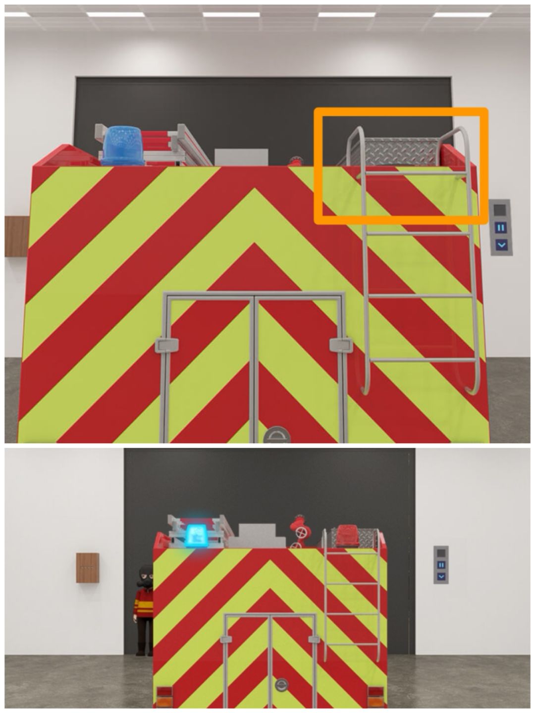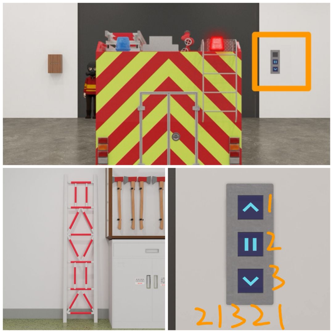 34. 把按钮安在消防车右边的墙角,然后根据斧子边的梯子上的提示(=↑↓=↑),按按钮。