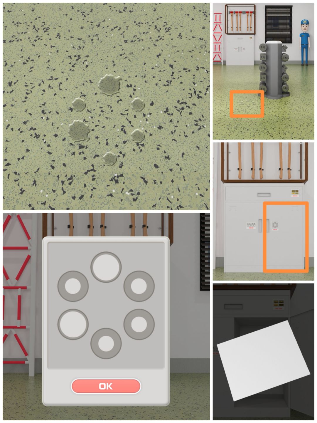 9. 点击地板,可以看到汗滴成的一个图形,用于打开斧子下方的右边柜子,得到一张白纸。