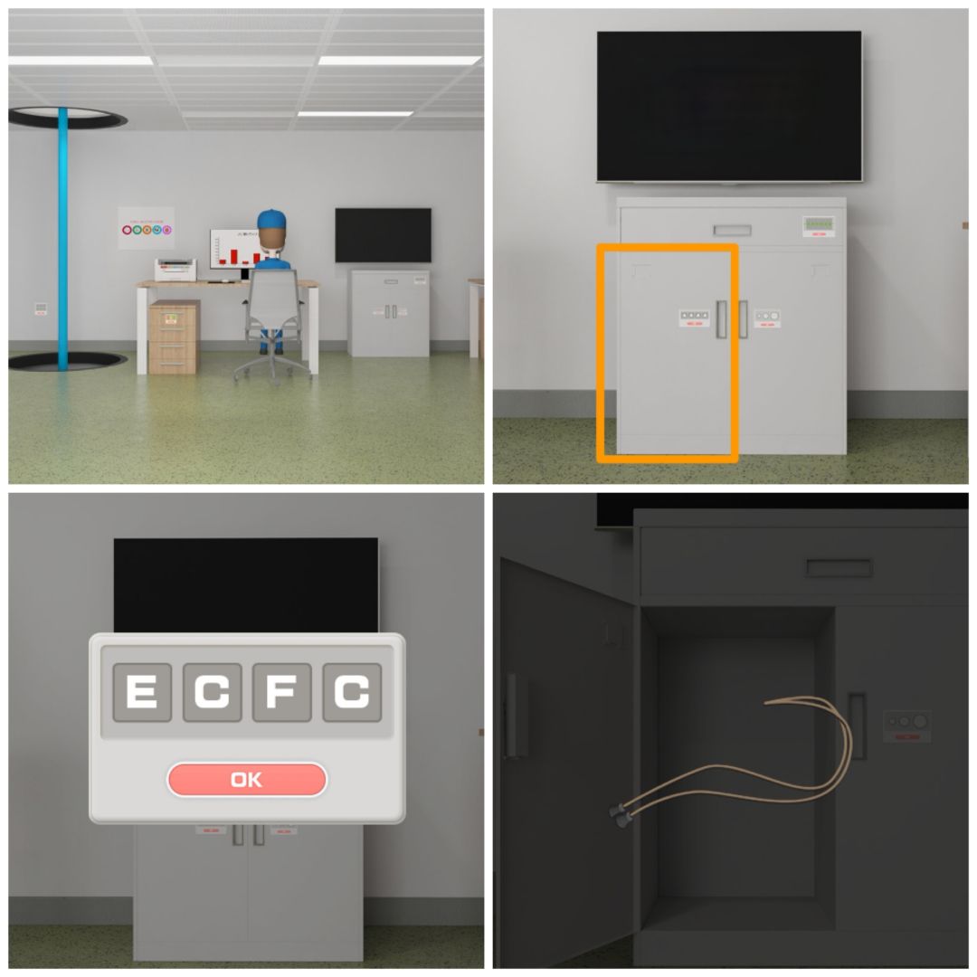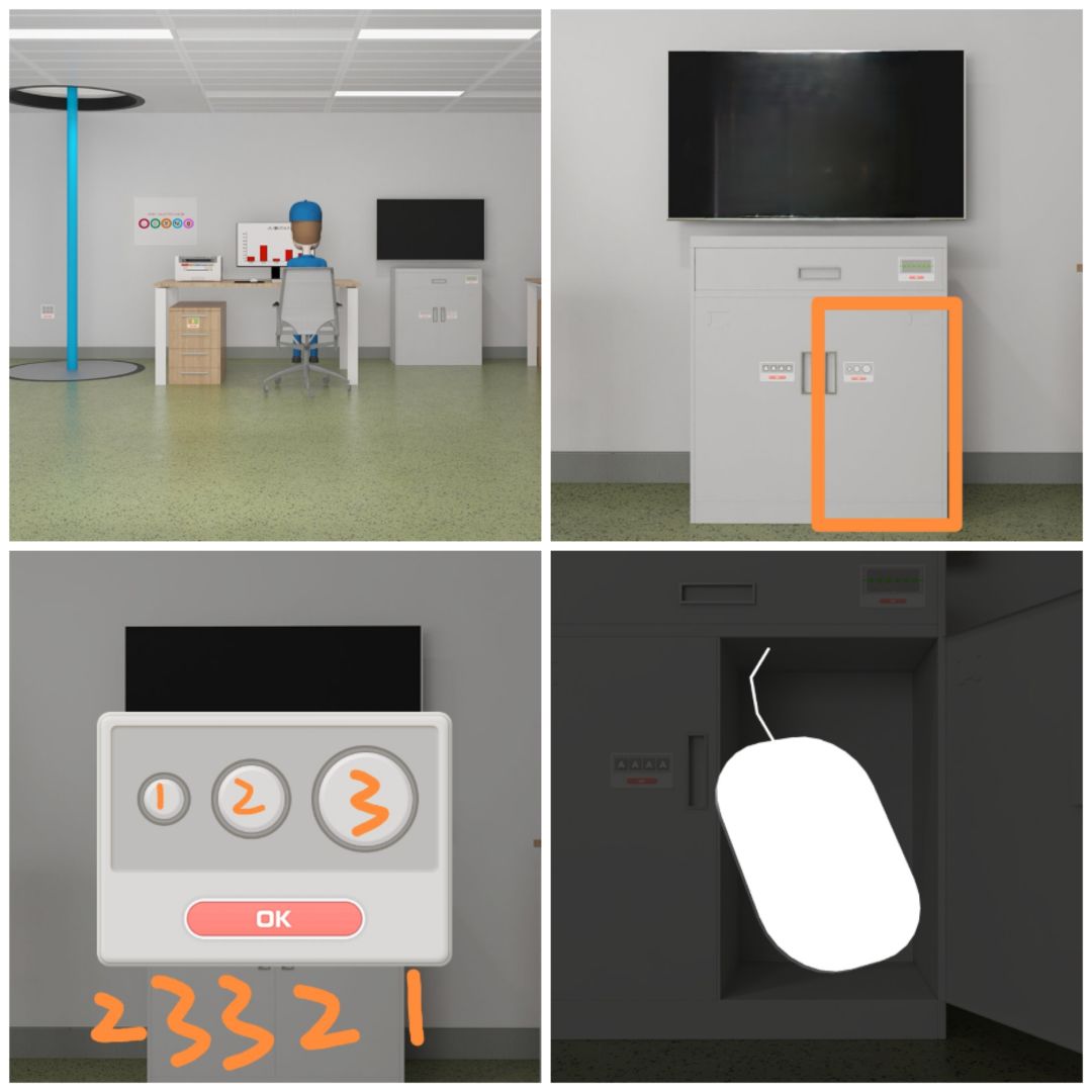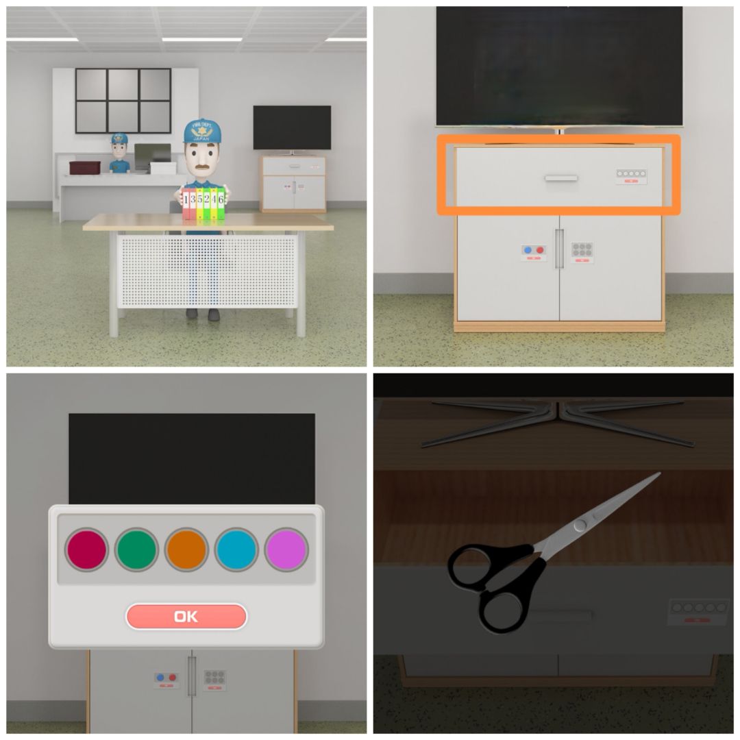 14. 根据圈的颜色顺序(红绿橙蓝粉),可以打开有文件夹的场景的抽屉,得到一把剪刀。