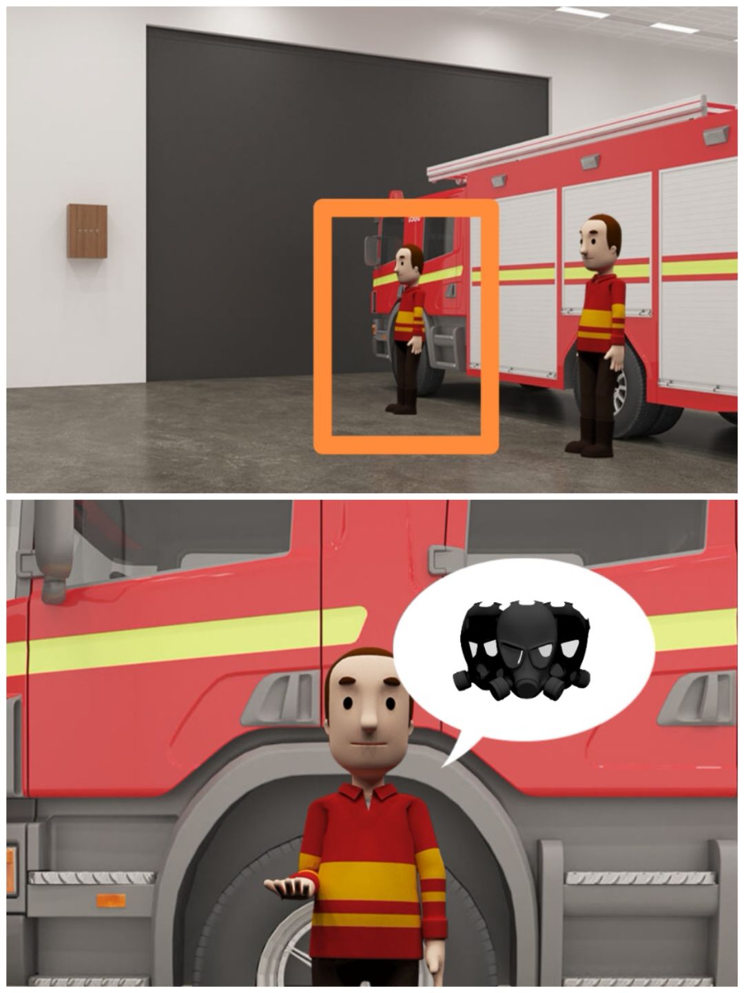 21. 从滑杆下去,点击消防车左侧的人,把防毒面具给他。