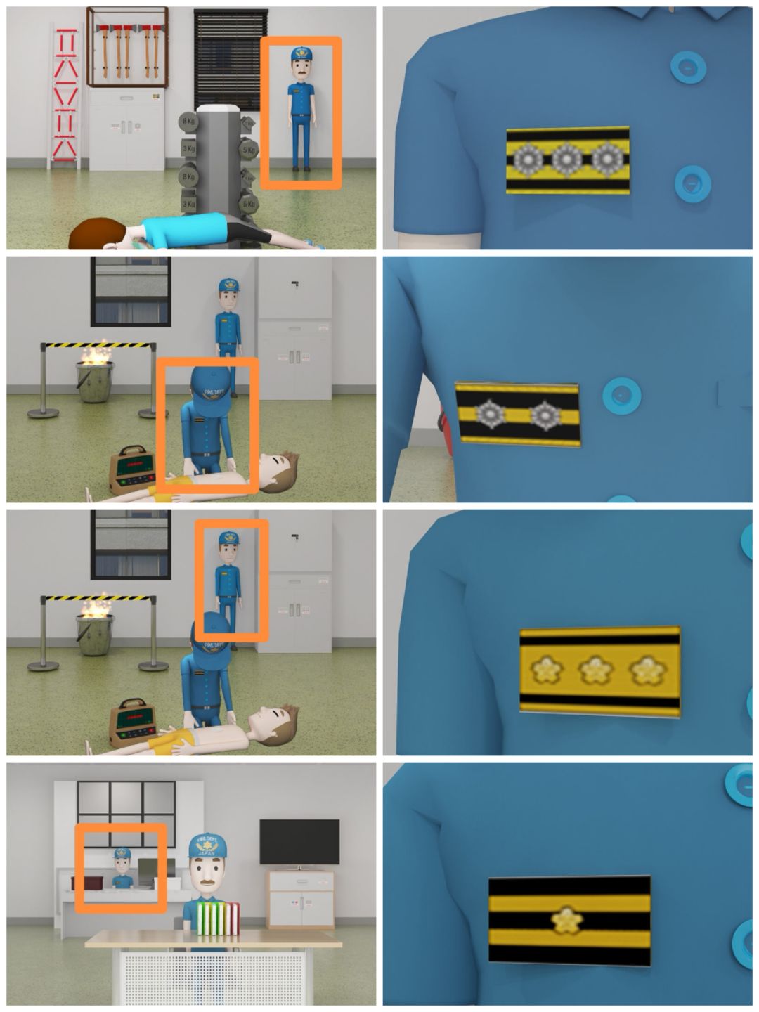 1. 查看四个警员胸前的徽章,记住上面的图案。