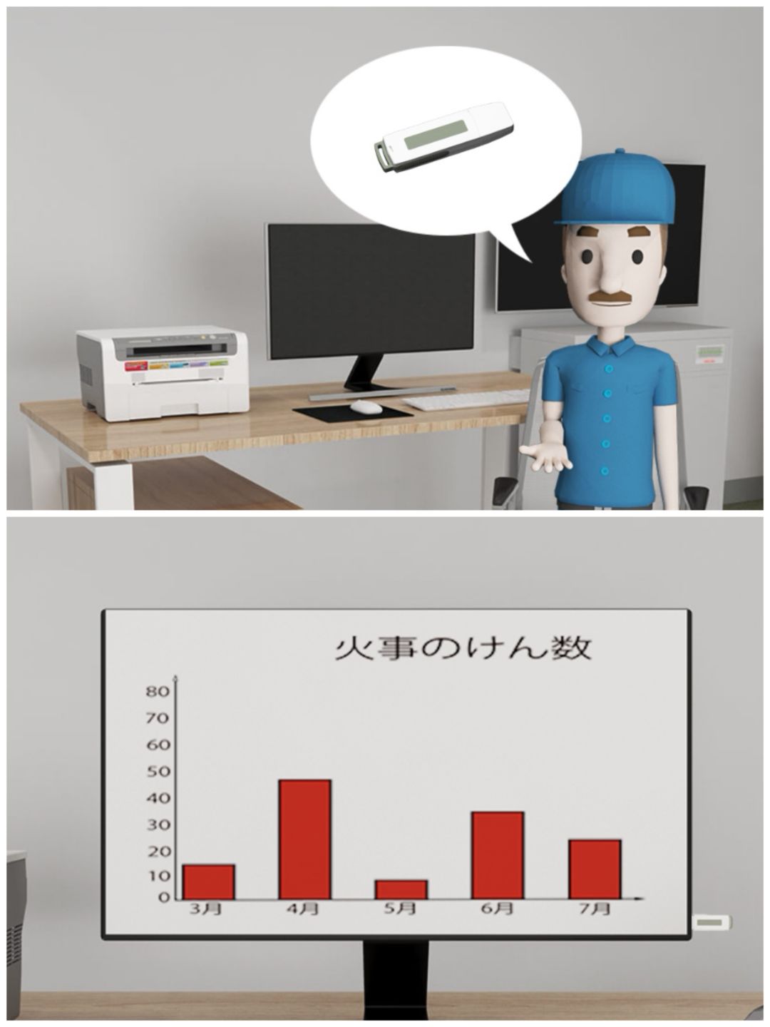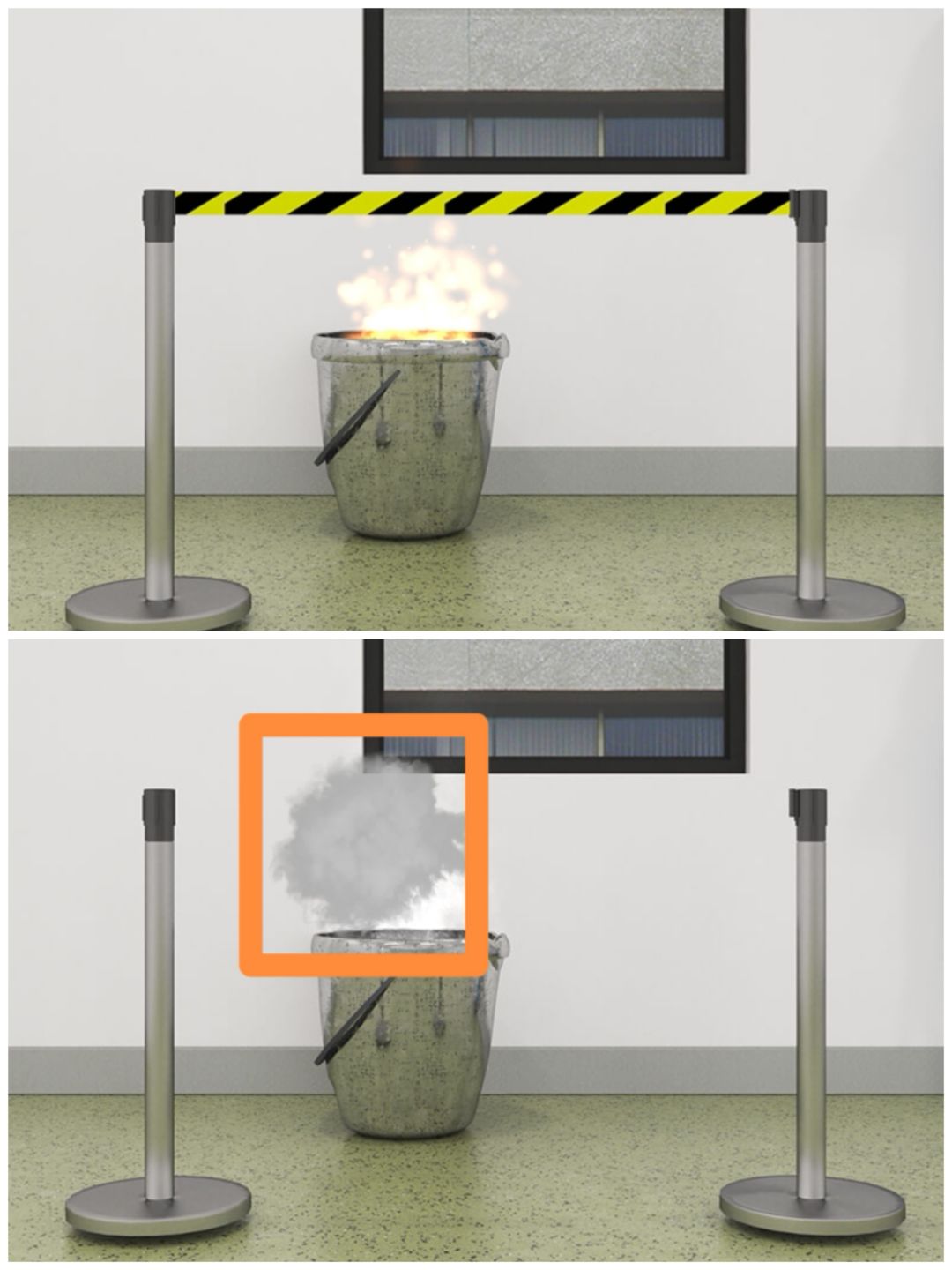 15. 使用剪刀剪断警戒线,对桶使用灭火器,然后观察喷出的烟的大小(中大大中小)。