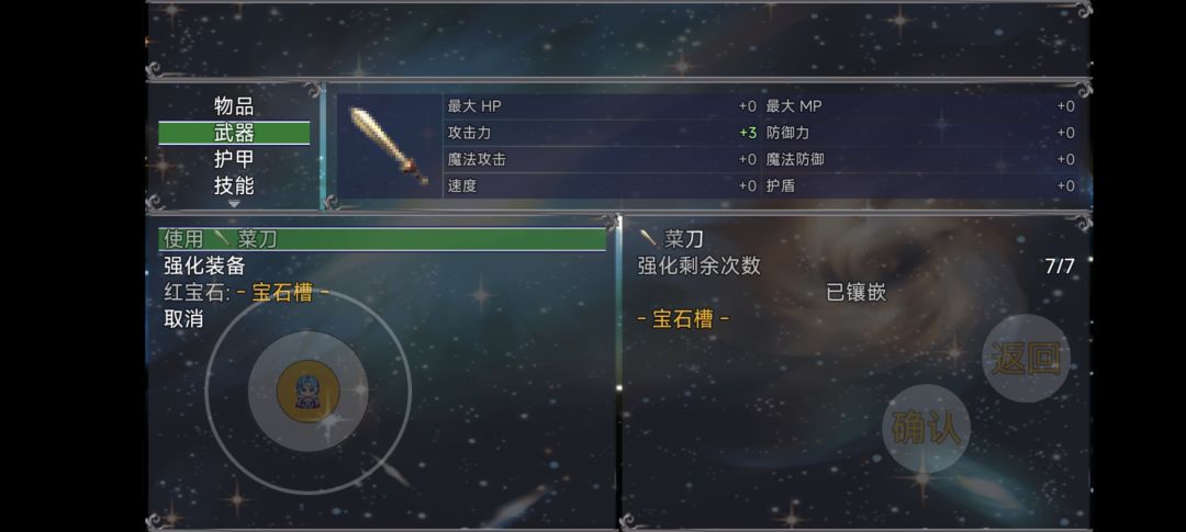 点击返回-物品-武器/护甲-选择装备-选择空宝石槽-选择宝石,或者点击返回-装备-装备强化-装备增强,镶嵌前提是装备具有相应颜色的宝石槽(宝石槽分为红、绿、蓝三种)