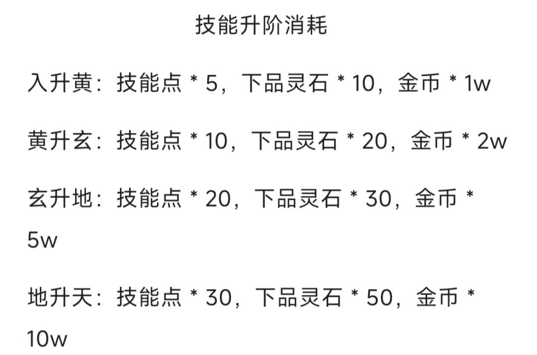 技能升阶会消耗技能点、金币、下品灵石,相应消耗如下