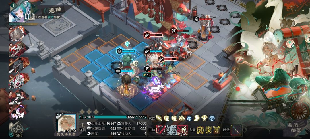 鹿王的技能设计上已经说明了,越挨打越强,越挨打怪越弱,越挨打动的越多,所以在关卡中需要拉更多的仇恨,少人就是一个选择,但伴随的问题是输出总量不够,因此队伍缺失的位置需要其余输出来补,在奶妈绑定鹿王的情况下,其余输出需要有很强的收割能力,愿望杯,仙鹤,彩凤,马蹄,铜壶等,鹿王的玩法就是不断偷攻击,然后转移,继续偷其他怪的攻击,最后和队友一起收割,这就需要考虑收割顺序。#物华弥新