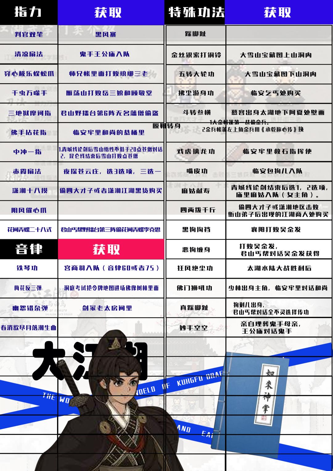 大江湖武功秘籍。特殊功法,暗器,心法,指力获取方式大全。这篇是