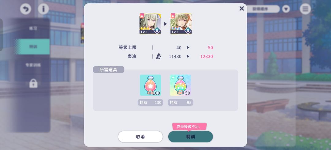 游戏游戏中当玩家将角色整体的上限拉到40级时,这个时候就需要用一定的道具进行特训了。我们可以理解为其他游戏中的等级突破,而不同的是这款游戏等级突破后玩家还可以获得新的演出服饰。