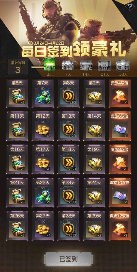 活动期间,指挥官每日登录游戏并在活动页面点击签到按钮后即可领取奖励,累计签到一定天数,即可领取对应的累签礼包,具体礼包奖励如下图所示: