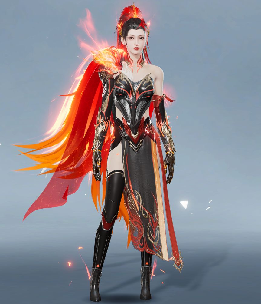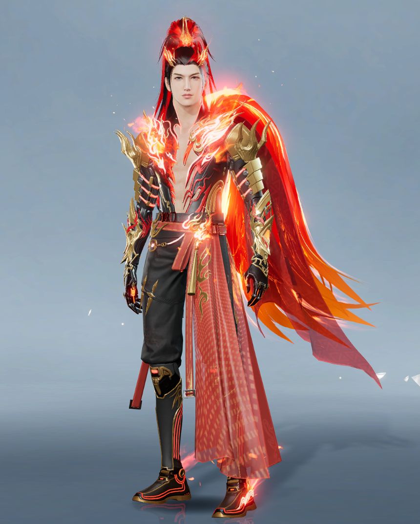 男款黑色与红色交织的紧身衣搭配金色纹路,既凸显力量感又不失精致。下身黑色长裤搭配红色的飘逸长摆,走路时随风舞动。肩部有着夸张且造型独特的金色火焰装饰,配合身上闪烁的火焰特效,给人一种被火焰之力加持的感觉。