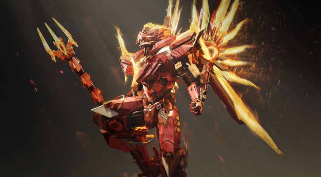 「朱焰鎏金」战甲涂装,以炽烈的红色为主基调,耀眼的金色点缀其间,宛如烈焰中锻造而成的战神之铠。背部巨大的金色羽翼状结构尤为夺目,仿佛承载着太阳的光辉,散发出无法忽视的威严与力量,极具视觉冲击力!