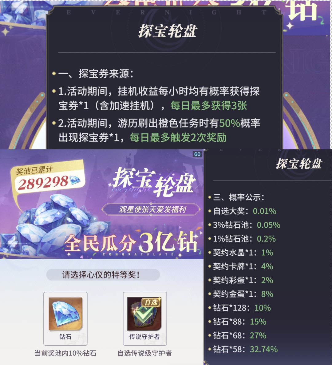 挂机出【探宝券】最多有三张,这些算是福利,是白嫖吧,虽然是有机率,大奖好像没有保底,但是你要清楚这可是活动,白嫖啊,福利啊,你去买彩票都要花钱去买,都不一定中奖,而这个活动,你肯定能得到不同的奖励,百分百有。(让我选奖励,我肯定选自选,毕竟我觉得两个奖都有可能和我无缘,既然这样,我索性选最低几率的)