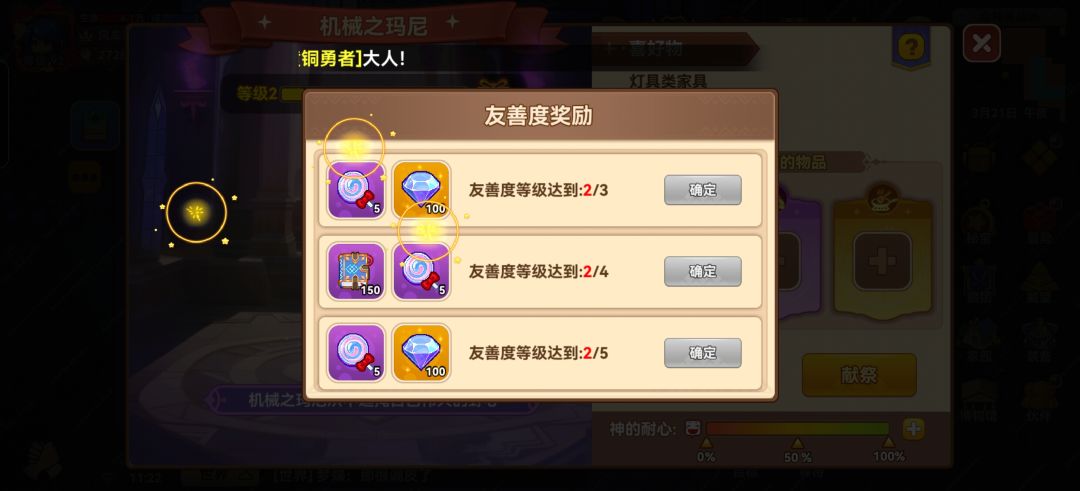5.财富之神留项链和戒指每个 10 经验,可白嫖奇珍币(博物馆币子)和钻石,最终奖励《彩虹波板糖》