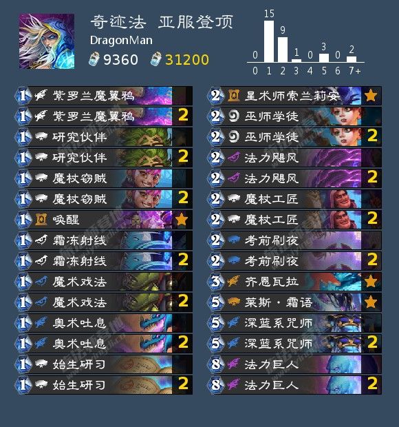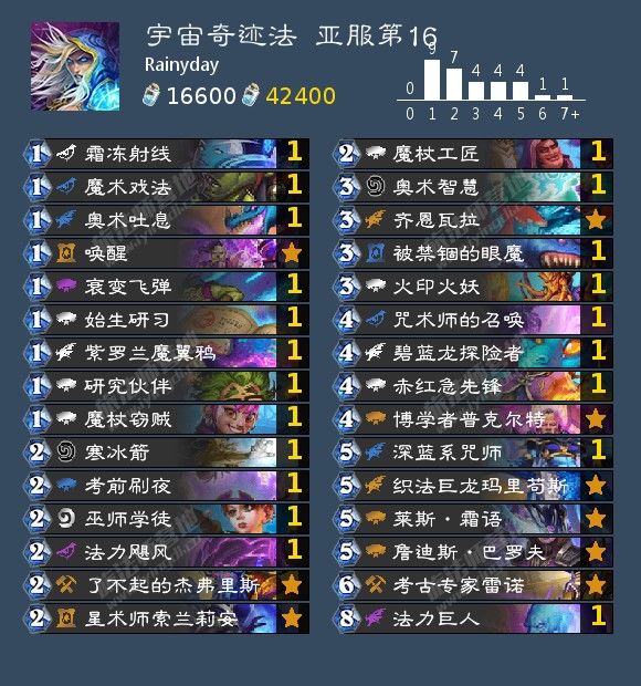 虽然带深蓝系咒师的奇迹法是主流,而且从道理上说奇迹法打DH靠的主要是随机(或者说奇迹法打什么对局都与随机密切相关),但我还是觉得带詹迪斯·巴罗夫和咒术师的召唤的构筑更适合现在的环境,这也就是我上周说的“关于奇迹法特别私货的私货”。这是因为现在环境里DH的数量较多,而奇迹法本身血很少,道行不够的话很难靠防守在碎片瞎面前占到便宜;可是主打进攻时往往可以起到“互爆”的效果,毕竟碎片瞎其实比较难应对连续的小展开。而与深蓝系咒师奇迹法相比,带詹迪斯·巴罗夫和咒术师的召唤的奇迹法在进攻轮次、持续性和爆发上似乎都更好。