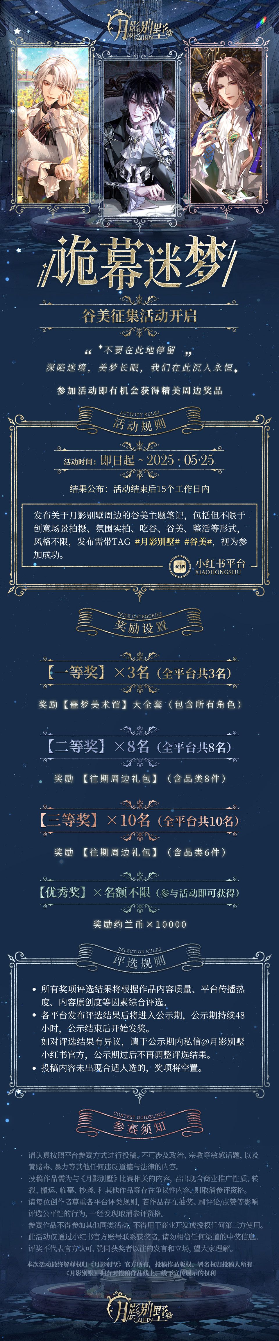 发布关于月影别墅相关周边的图文,视频,包括但不限于创意场景拍摄、氛围实拍、吃谷、谷美、整活等形式,风格不限,话题带#月影别墅# #谷美#,视为参加成功。