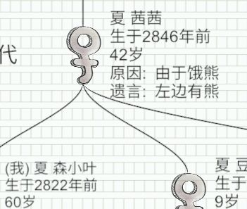 在新手一,很久以前的夏家,图中这位绿妈妈我出生没多久,她就把自己的绿衣服给了我,自己随便穿,我和她聊的来,可突然我就找不到她,后来才发现被熊咬死了,大概是她知道我会看族谱找她,所以报了位置,然后我又去了夏家,杀了熊但我还是没找到她,这是个温柔的好妈妈,于是我画了这张画纪念她