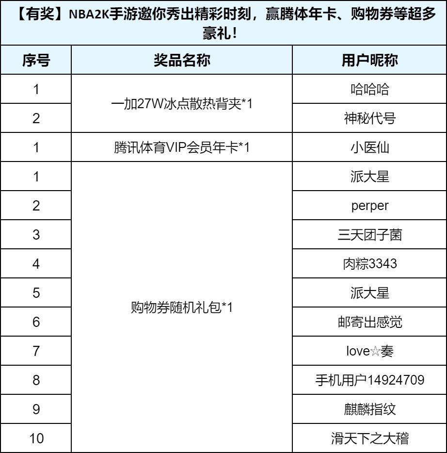 全明星们,大家期待的开奖时间到啦~恭喜以下的幸运玩家获得奖励,请于4月13日18点添加发奖大使QQ(1090005694)提供相关信息,腾讯体育VIP会员年卡,一加27W冰点散热背夹请提供收件相关信息,购物券随机礼包请提供游戏账号相关信息。所获实物奖品将在收集信息后的30个自然日内完成发放。本次没有实物奖励的全明星们也不要气馁,社区里其他活动多多,积极参加下一个获奖的也许就是你哦~