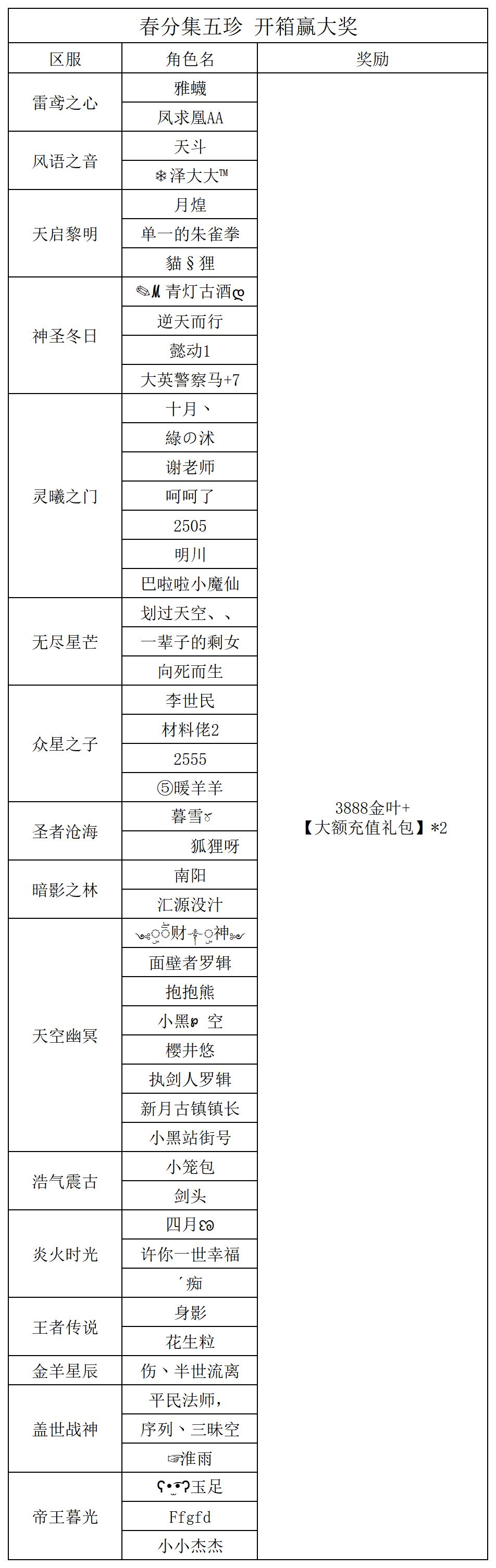 恭喜以下获奖玩家,奖励将于7个工作日内发放,如有疑问请及时联系客服~玩家可自行将相关道具进行清理。