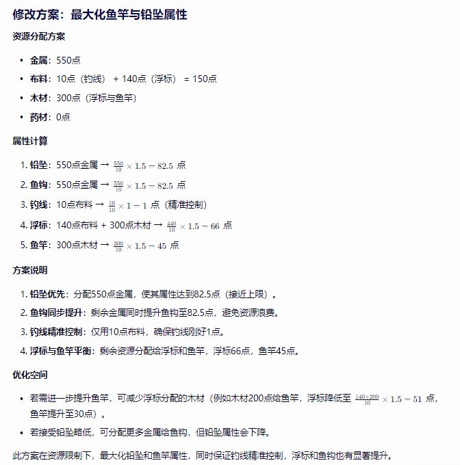 根据鱼竿的属性,个人感觉鱼竿的上钩区域变大与铅坠的减少区域滑动为最主要的属性,而钓线的偏离上钩区域变少的属性不是很有用,于是再给出一个特化方案。