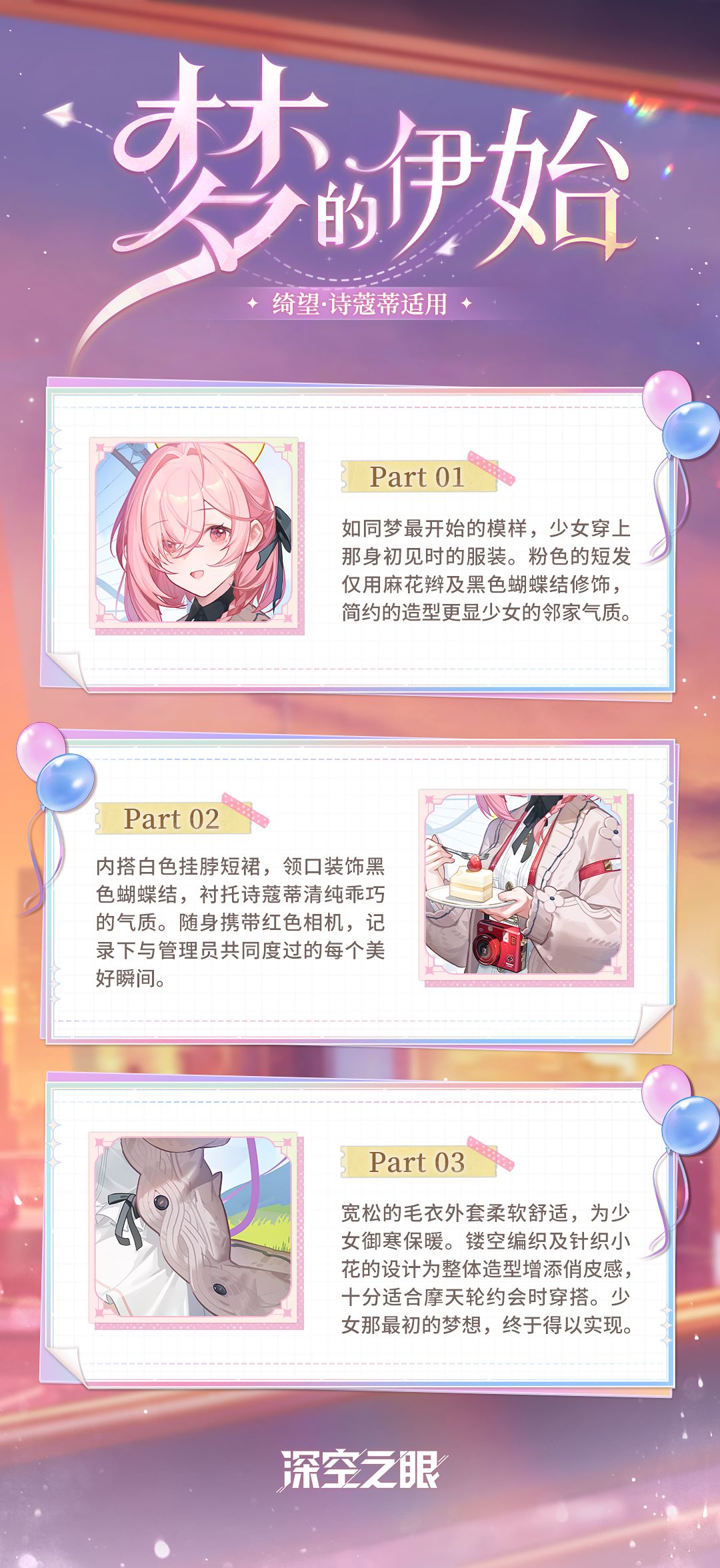 绮望·诗蔻蒂全新换装「梦的伊始」现已登场!3月27日维护后-5月8日05:00活动期间,管理员可通过参与庆典贺礼活动获取。