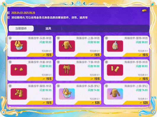 当肠肠拥有一定数量的金条后,还可以兑换各种品质的【海啸战甲】部件,最高可直接兑换神话品质的【海啸战甲】