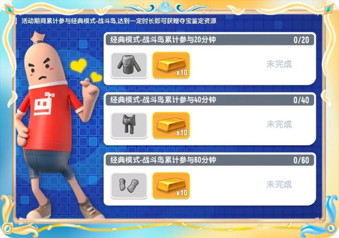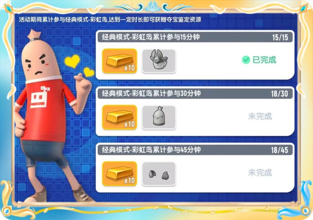 当肠肠累计游玩【经典模式-战斗岛】和【经典模式-彩虹岛】达到指定时间后,即可获得未鉴定的【海啸战甲】部件以及一定数量的金条