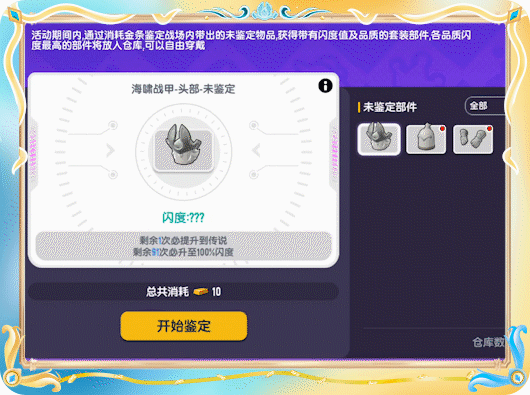 当肠肠从对局中成功带出未鉴定的【海啸战甲】部件和金条后,可以前往【活动-珍宝-珍藏鉴定】界面消耗金条鉴定【海啸战甲】部件!每次鉴定完成后,将会获得带有闪度值和品质的套装部件。品质闪度值最高的部件将放入仓库,肠肠可以自由穿戴。