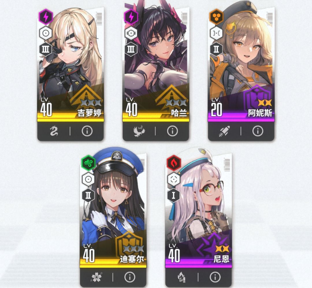5. 前期我是这么配的:防御就用送的迪塞尔,火力是吉萝婷、哈兰、辅助用的SR尼恩,另外一个因为我没有其他的辅助和SSR了,所以用的可以平摊伤害的阿尼斯