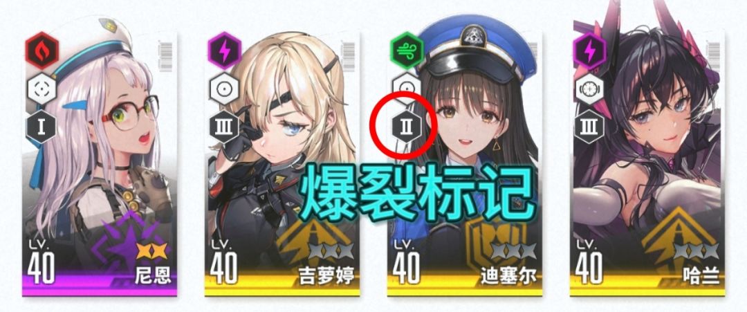 2. 每种角色有爆裂技能段数标记(Ⅰ、Ⅱ、Ⅲ),例如迪塞尔为“爆裂Ⅱ”,而“全爆裂状态”要求Ⅰ、Ⅱ、Ⅲ段爆裂技能依次释放才能触发,所以队伍里三种段数标记的角色都要有,这是打高输出的硬性要求