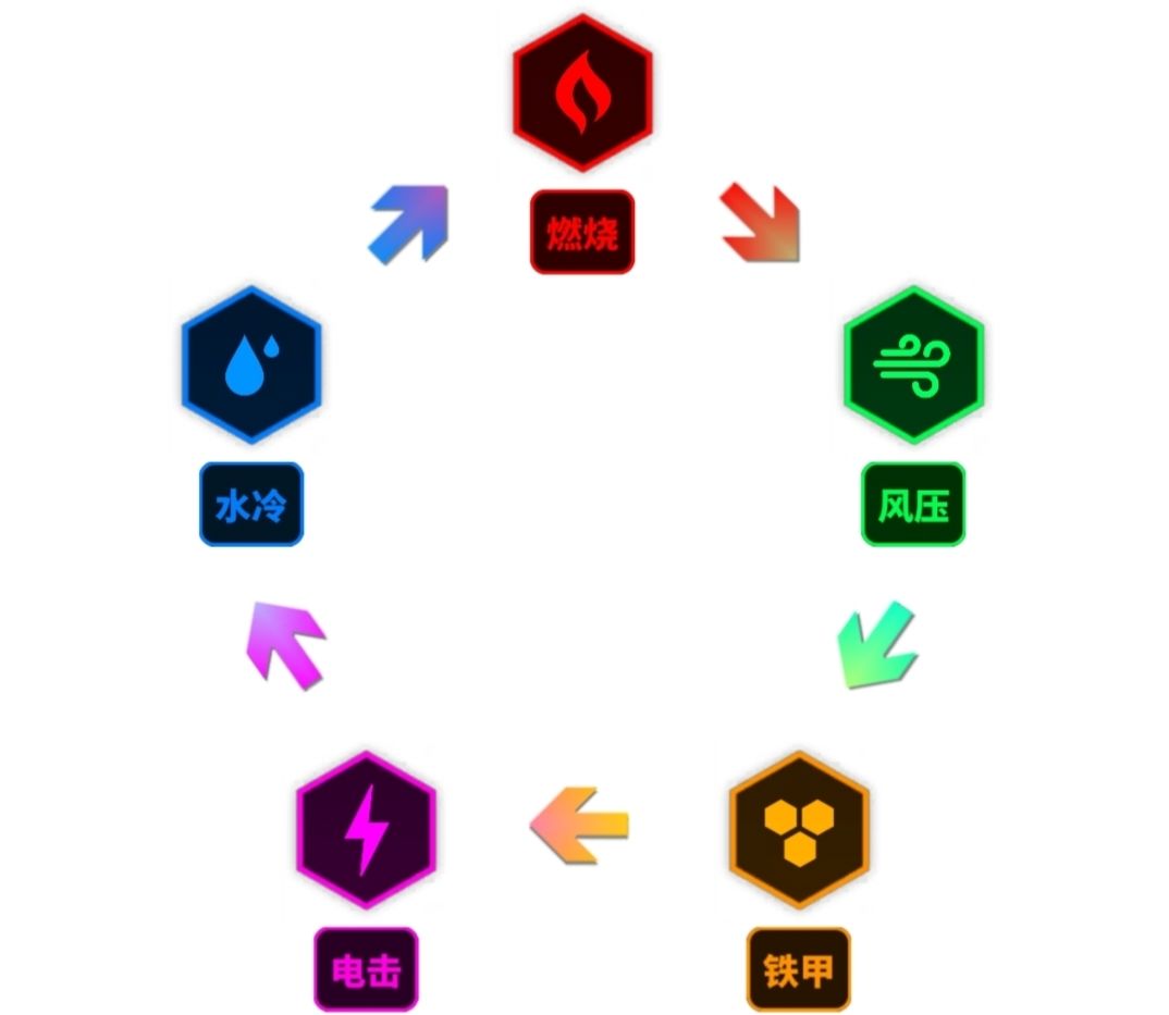 - 克制关系如下图:燃烧→风压→铁甲→电击→水冷→燃烧