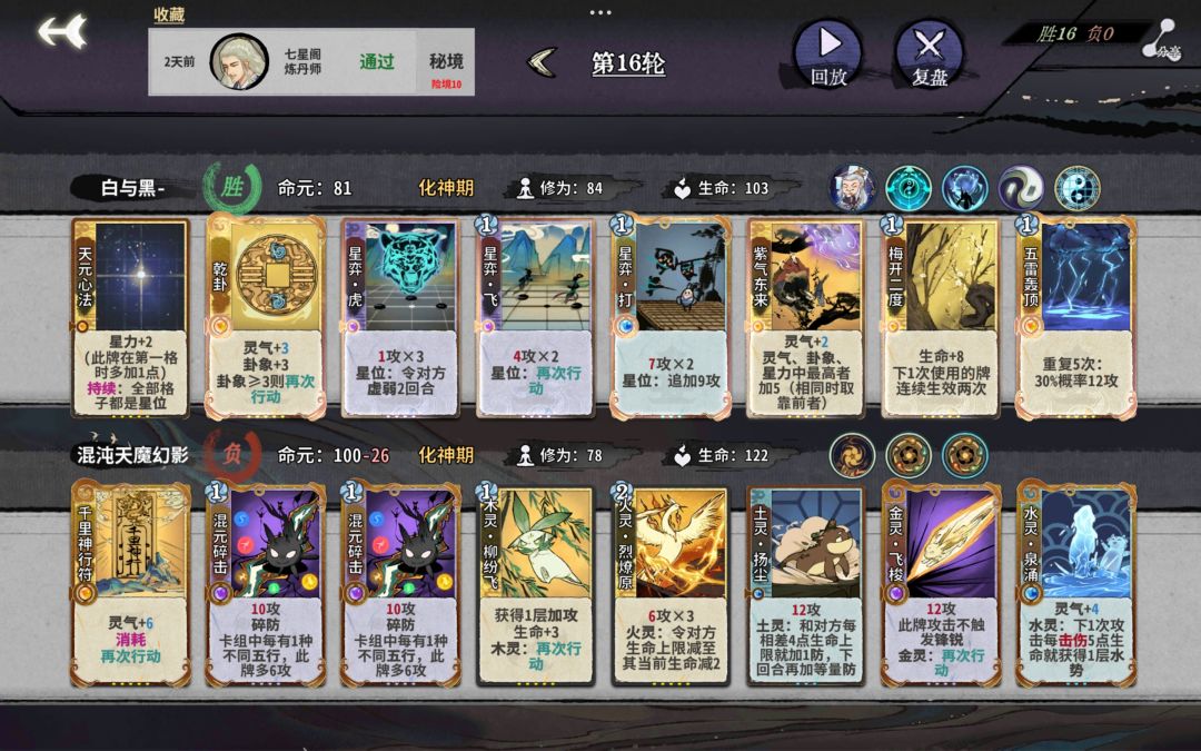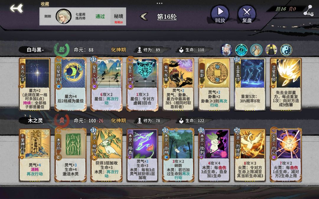 第5轮直接上金丹,优先拿观星或修为仙命,从这时开始到化神基本都不用d牌,伤害够了。