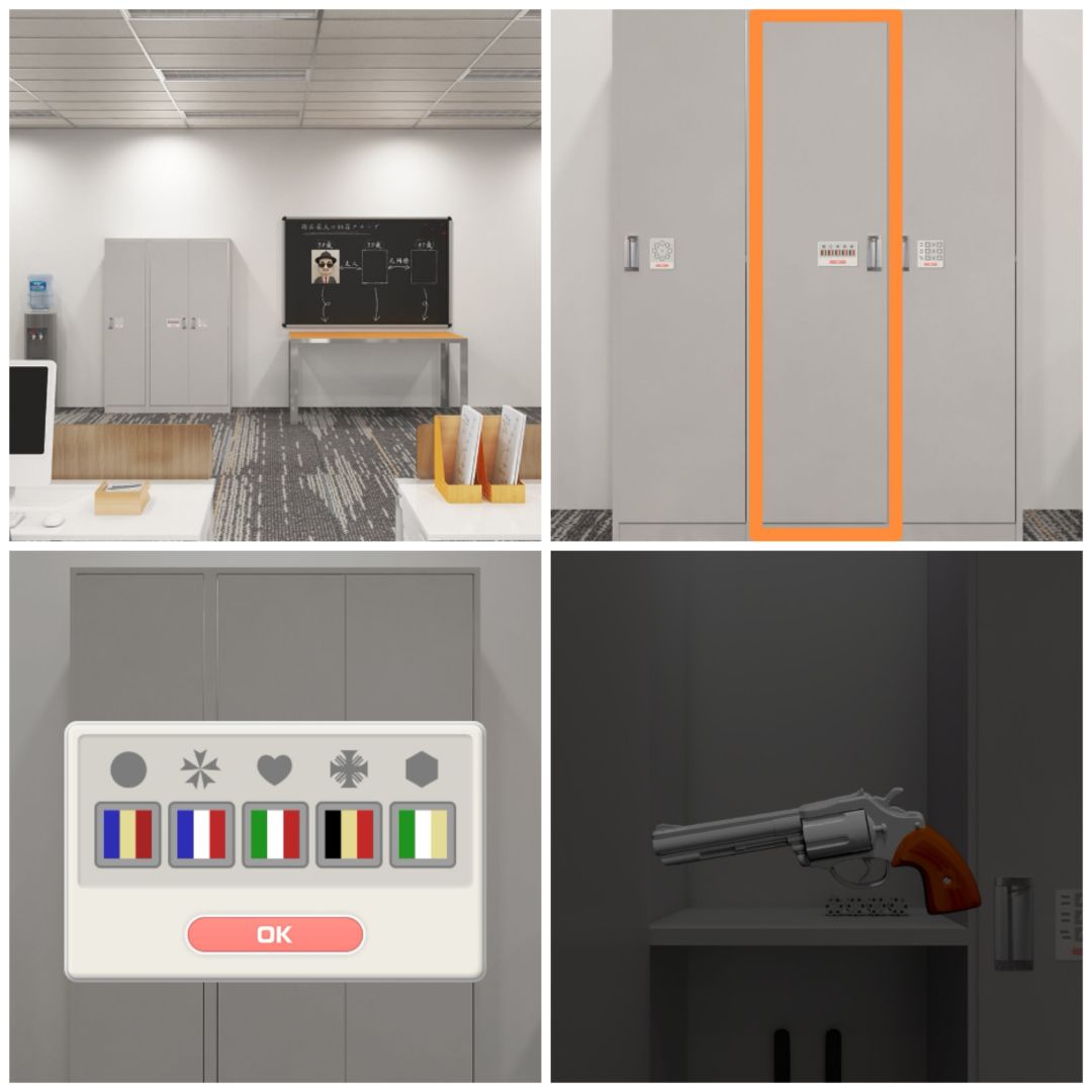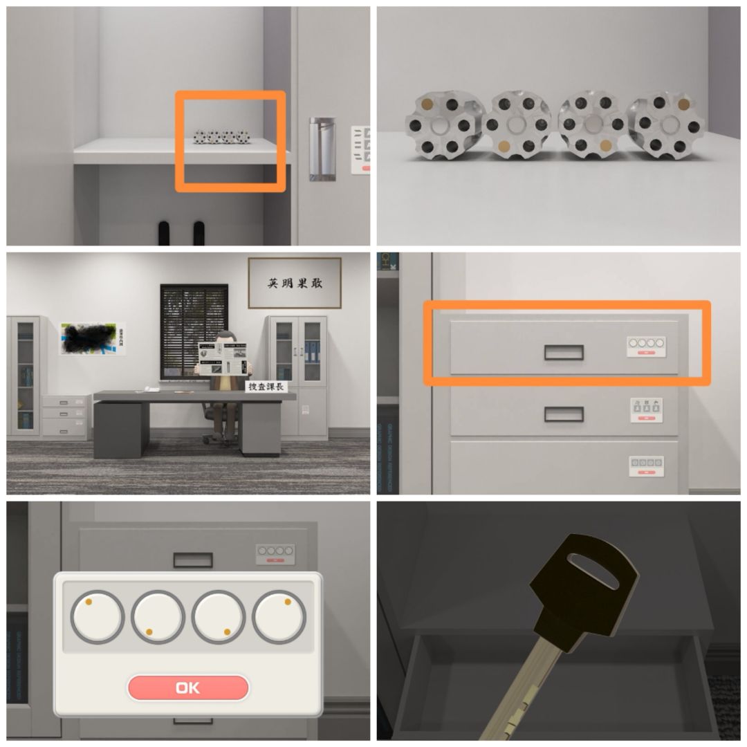 3. 查看柜子里的四个弹夹,观察子弹的位置。可以打开课长办公桌左边的第一层抽屉,得到一把钥匙。