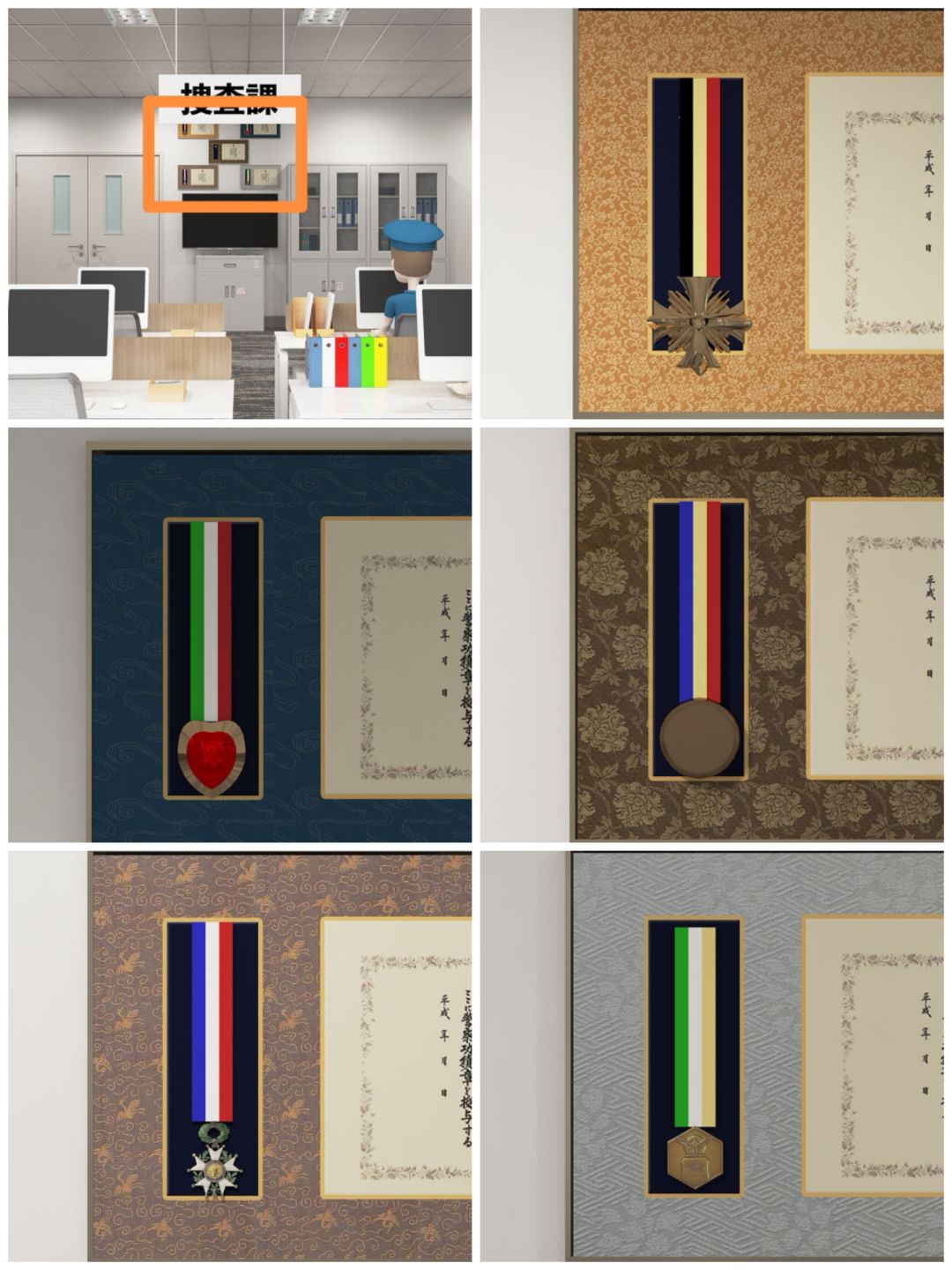 1. 查看搜查课场景墙上的五个徽章,观察形状以及带子。