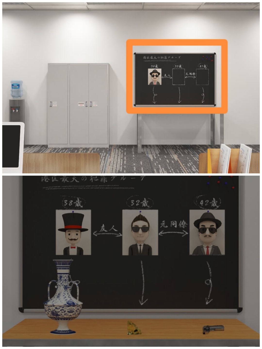30. 把通缉犯照片放到黑板上,钻石、古董花瓶和枪放到黑板前的桌上,然后根据课长桌上的通缉犯,调整位置。