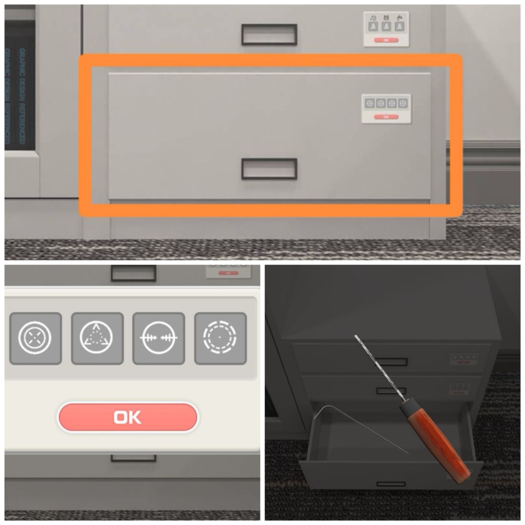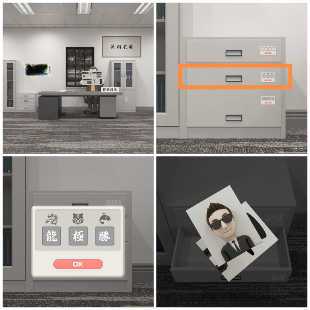 10. 使用毛巾擦干净课长办公桌左边墙上的纸,得到四个位置的图案,可以打开两扇门之间电视下的第三层抽屉,得到一张面的宣传单。