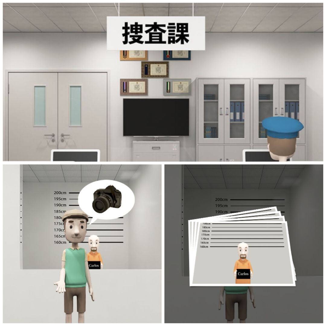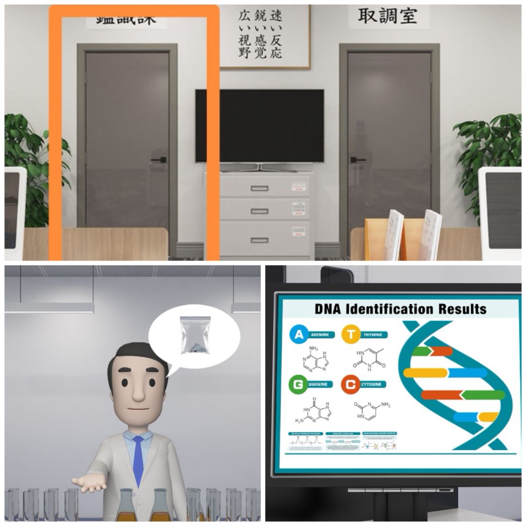5. 进入搜查课场景的门里面,把相机给绿衣服,得到四张罪犯的照片。