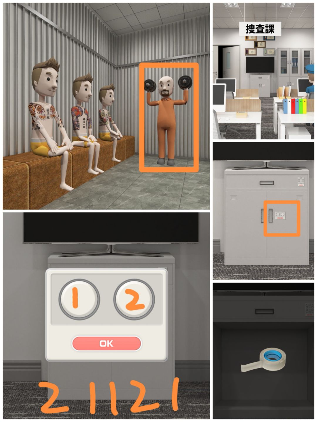7. 点击举哑铃的人,记住他的举手顺序,可以打开搜查课场景电视下的柜门,得到一卷胶带。