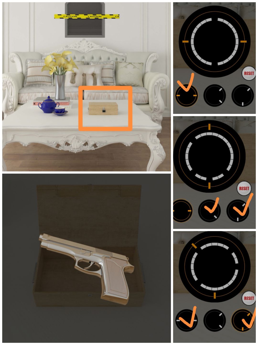 19. 使用开锁工具打开右边的木盒,开锁方法在图上(选择以后要点击大圆边上的圈),得到一把枪。