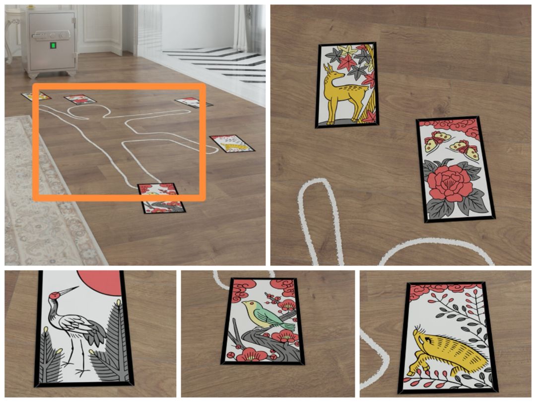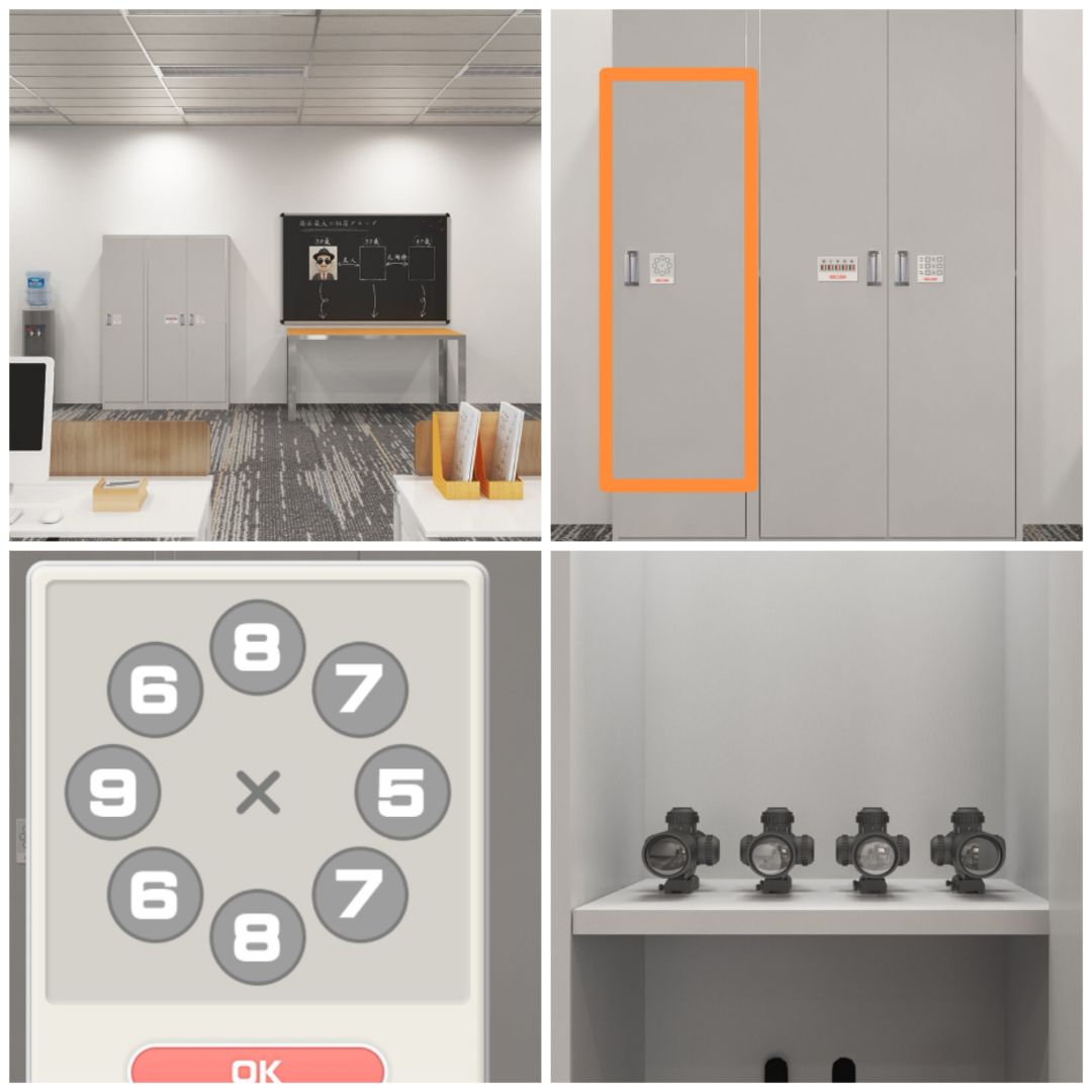 15. 查看四个射击牌,可以发现八个弹孔的方位正好可以组成一个圆,观察各个方位的数字,可以打开黑板场景的第一个柜门,发现四个倍镜。