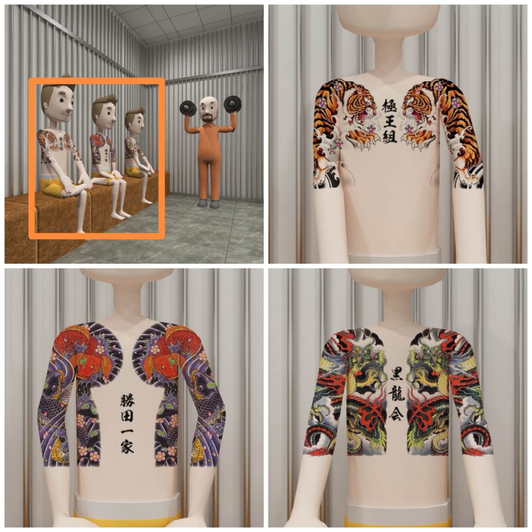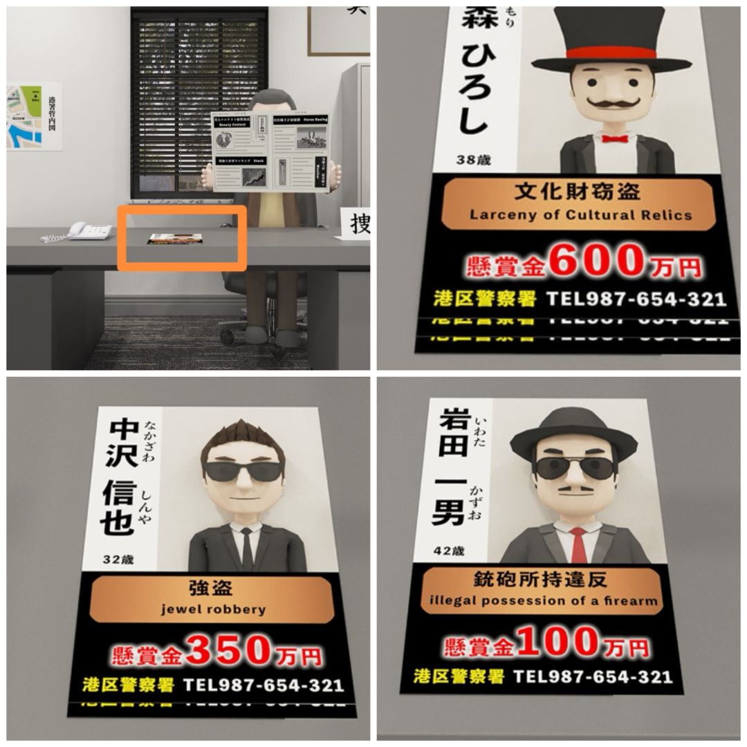 8. 查看左边坐着的三个人身上的纹身以及对应的文字,可以打开课长办公桌左边的第二层抽屉,得到两张通缉犯的照片。