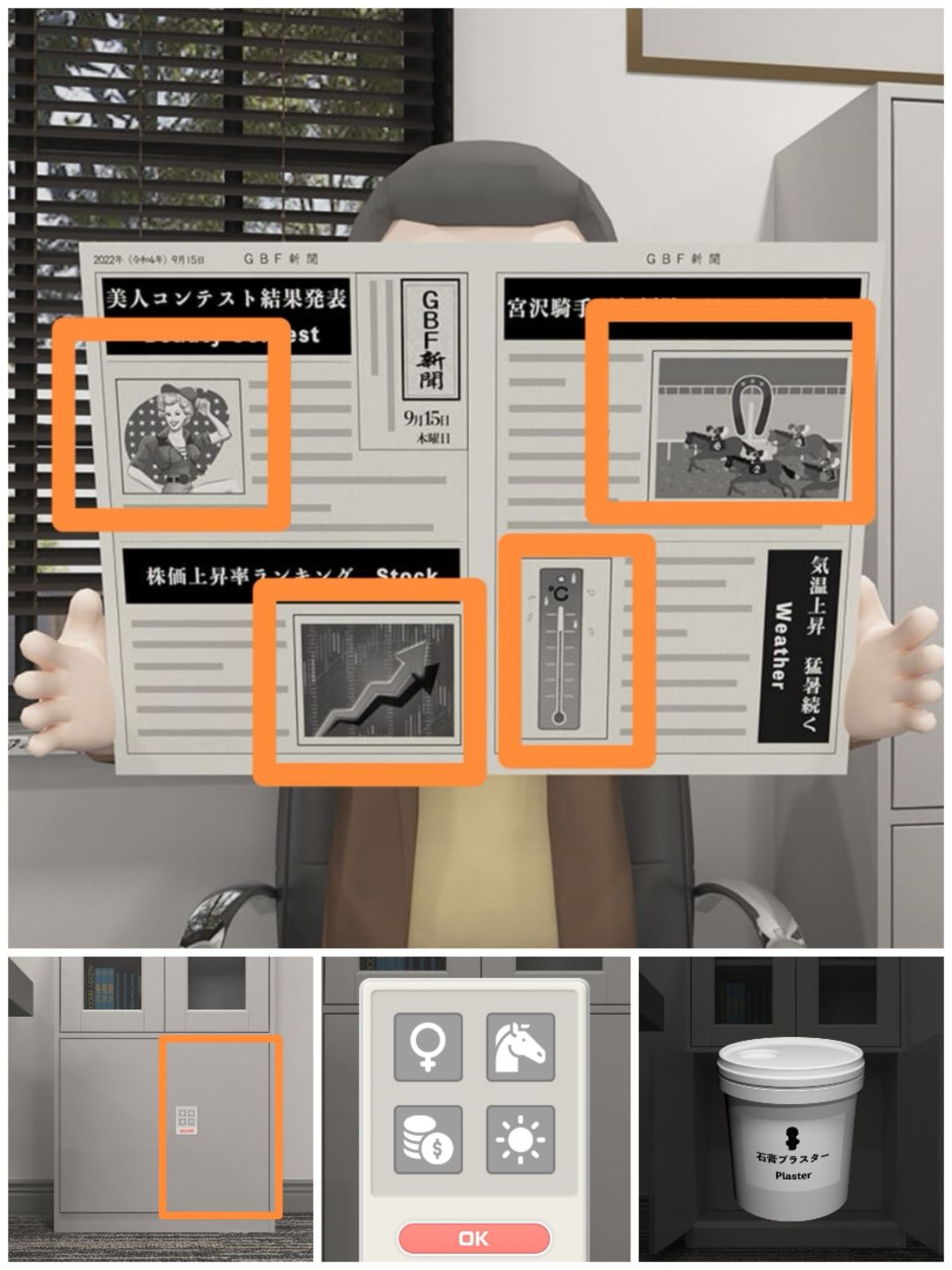 13. 查看课长看的报纸,四张图片分别为:女人、马蹄铁、股票上升、温度上升,可以打开办公桌右边的柜门,得到一罐石膏。