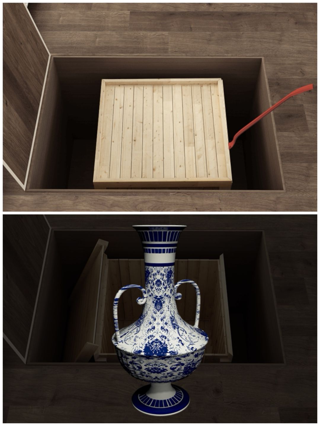 28. 使用撬棍打开木箱,得到古董花瓶。