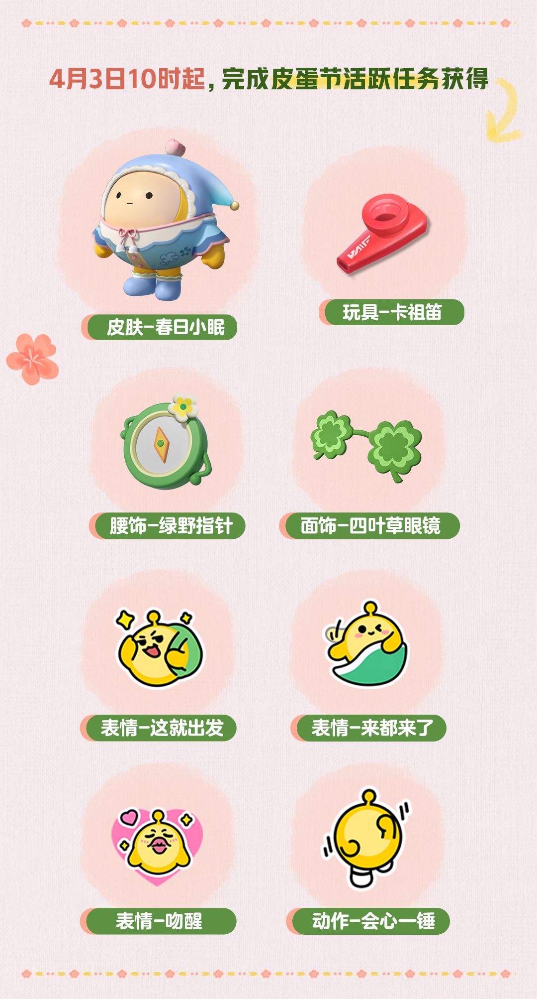 ▸▹ 春游大作战:皮蛋节特别出游节目开启,竞速之余领取表情奖励。