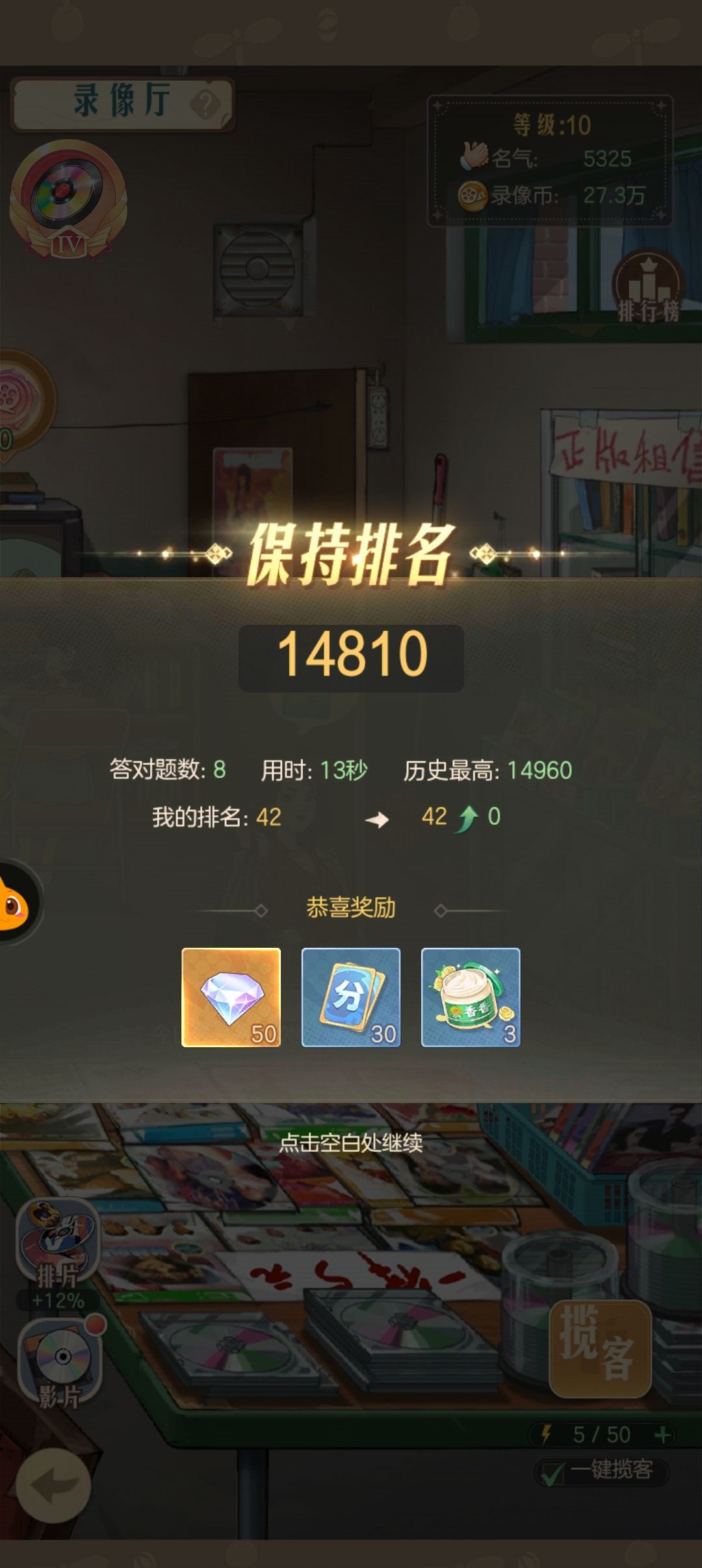 录像厅每天有两次答题机会,尽量多答对题给钻石的几率大一些,关于答案tap已经有很多攻略贴了,我就不再重复啦。