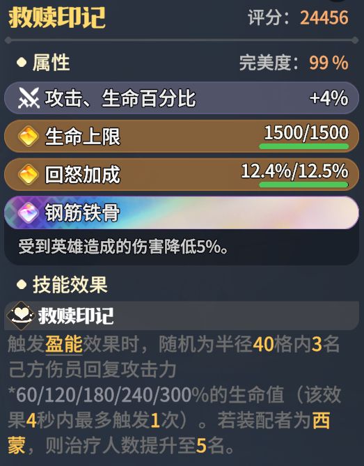 1、救赎印记(专属): 触发盈能效果时,随机为半径40格内3名己方伤员回复攻击力*60/120/180/240/300%的生命值(该效果4秒内最多触发1次)。若装配者为西蒙,则治疗人数提升至5名。