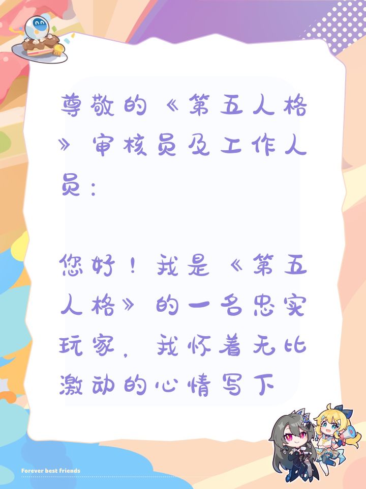 您好!我是《第五人格》的一名忠实玩家,我怀着无比激动的心情写下这封申请信,希望能够获得共研服的资格,为我所热爱的游戏贡献一份力量。