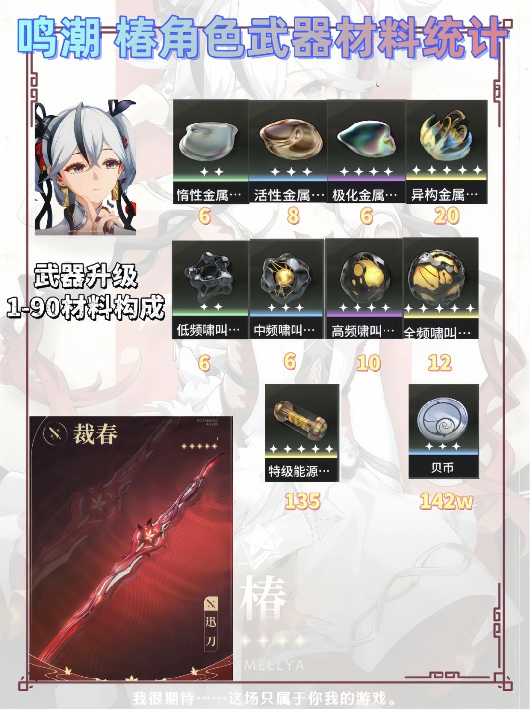 武器推荐:专武「裁春」必抽,提供普攻伤害加成与协奏能量回复;次选常驻五星「千古洑流」