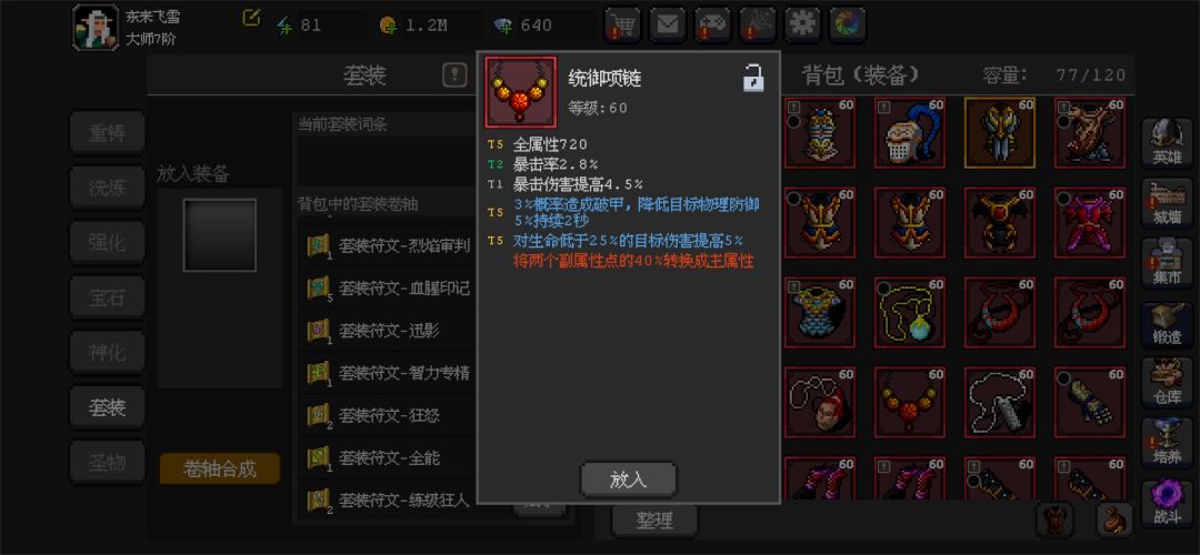 所以你前期你不用管啥装备属性,有套装属性的一定先留好。优先给主c配好。60级前,不用考虑太考虑装备属性。也不用强化啥的。