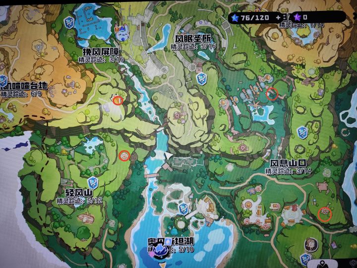 如图二所示,红色⭕圈起来的地方就是他们所在的位置,具体位置如图3-4所示,都是是风车,只不过峡谷那个是大型风车(风车上还有一颗星,没捡到的可以收一下),不是塔型风车。基本都可以在传送附近,胖子可以通过炼金锅传送