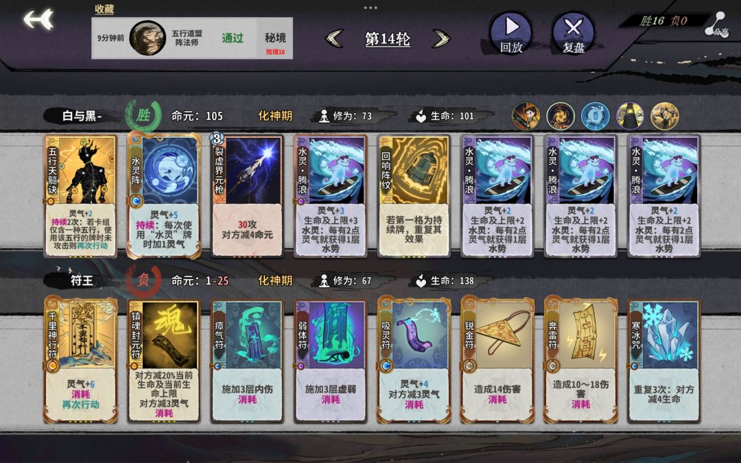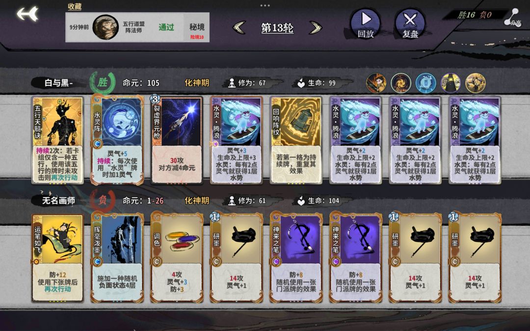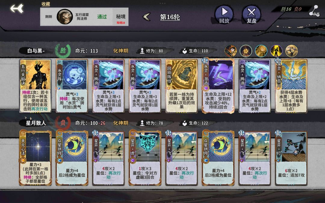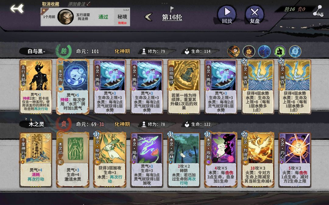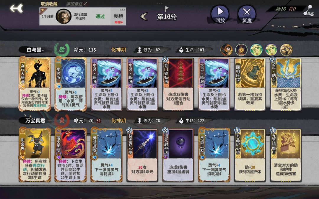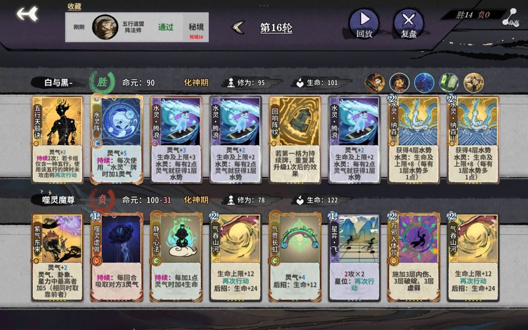 第11轮上化神选自带仙命拿两张金丹期以上水牌,这里拿了个水阵和泉涌,然后开始d牌找天髓回响纳百川什么的,这里因为刚上化神没什么牌d,所以阵容基本上没什么变化。
